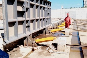 此合页坝大小为:192m*3m工程量为24扇坝闸(每扇为8m*3m)。是与安徽水利开发股份有限公司联合建设的项目,安徽水利开发股份有限公司前期考察多家公司,选定与我公司进行合作,本司承建整个项目的支撑系统,液压系统,控制系统,止水系统,安装。